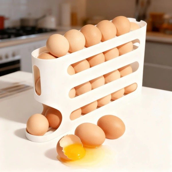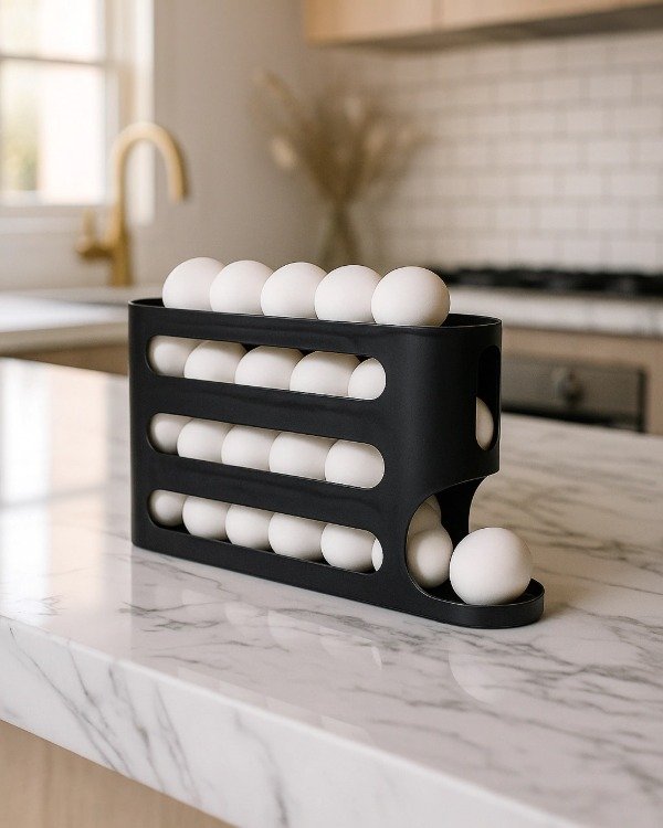 - Esto hace que funcione como dispensador, garantizando que los huevos se deslicen automáticamente a medida que se van sacando.